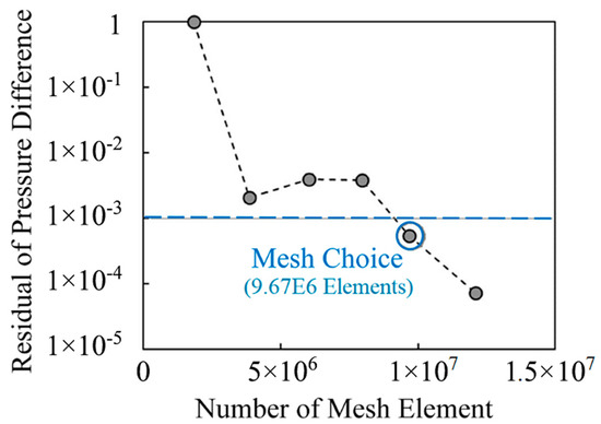 To analyze the flow field in a pump-turbine which is not visible in the model test, computational fluid dynamics (CFD) is used in this study. Figure 4 shows the domain used in CFD including volute, stay vane, guide vane, runner, and draft tube. The mesh is created for CFD simulation with size independence check. The residual of pressure difference between volute inlet and draft tube outlet is used as the criterion. Finally, a mesh scheme with 9,668,956 elements is chosen because the residual becomes less than 0.001 as shown in Figure 5. With this mesh solution, it is expected to achieve a good balance between computing resource consumption and accuracy.