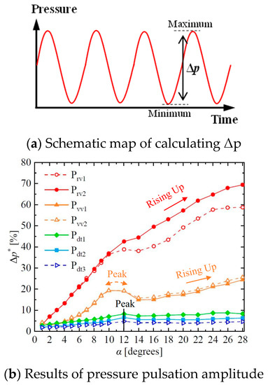 According to the common testing and analysis methods for pressure pulsation in hydraulic machinery [25,26,27], measurements were based on MICROSENSOR’s MPM489 pressure transmitter; its accuracy is 0.5%, the pressure range is −0.1~100 MPa, the output signal is 4–20 mA, and the sampling frequency is 800 Hz. The pressure pulsation amplitude by model test is shown in Figure 6, where the relative pulsation amplitude Δp* is defined as