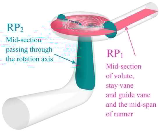 To understand the flow mechanism in the pump-turbine, two reference plotting positions are set in pump-turbine flow passages as shown in Figure 7. Reference position 1 (RP1) is the mid-section of the volute, stay vane, and guide vane perpendicular to the rotation axis and mid-span of the runner. Reference position 2 (RP2) is the mid-section passing through the runner rotation axis.