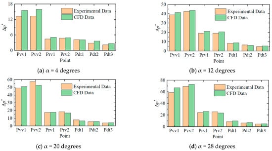 Four different guide vane opening conditions were compared, including the α cases of 4, 12, 20, and 28 degrees, covering the cases of weak, medium, strong, and local peak of pressure pulsation. Figure 8 shows the comparison of pressure pulsation amplitude between experimental values and CFD values at Prv1, Prv2, Pvv1, Pvv2, Pdt1, Pdt2, and Pdt3 points, respectively, and the 97% confidence level was still used. It can be seen that CFD simulation accurately predicts the amplitude of pressure pulsation, which can assist in the analysis of subsequent sections.