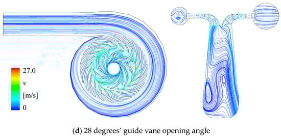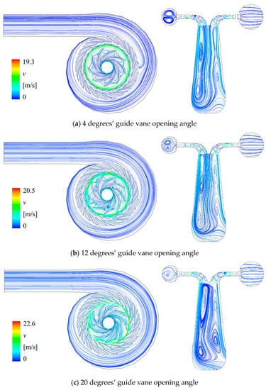Figure 9 shows the flow pattern distribution rule in the pump-turbine, which can reveal the local flow pattern and judge whether there are vortex, back flow, and secondary flow structures. When the guide vane opening angle is 4 degrees, the flow pattern in the volute, stay vane, and guide vane on RP1 is smooth. There are uniformly distributed large eddies inside the runner. The flow inside the volute on RP2 is symmetrical along the centerline, and there are many large vortexes inside the draft tube. The velocity between runner and guide vane is relatively high, reaching a maximum of 19.3 m/s. When the guide vane opening angle is 12 degrees, the flow pattern in the volute, stay vane, and guide vane on RP1 is still good. There are vortexes inside the runner, but their distribution is uneven, occupying a portion of the flow channel. The flow inside the volute on RP2 is symmetrical along the centerline, and there are many large vortexes inside the draft tube, which is similar to that at 4 degrees. The velocity between runner and guide vane is still high, and the maximum velocity increases to 20.5 m/s. When the guide vane opening angle is 20 degrees, the vortex flow inside the runner on RP1 becomes the flow dominated by the transverse secondary flow. The flow inside the volute on RP2 is symmetrical along the centerline, and there are many large vortexes inside the draft tube, which is similar to that at 4 degrees and 12 degrees. The maximum velocity between runner and guide vane further increases to 22.6 m/s. When the opening angle of the guide vane is 28 degrees, the flow inside the runner on RP1 becomes dominated by vortexes, and the distribution of vortexes is uneven. There is still a large vortex in the draft tube on RP2. The maximum velocity between runner and guide vane further increases to 27.0 m/s.
