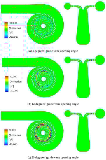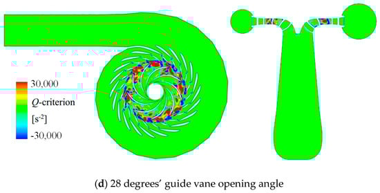 Figure 10 shows the vortex distribution pattern based on the Q-criterion on RP1 and RP2. When the opening of the guide vane is at 4 degrees, there are strong positive or negative Q values at the trailing edge of the guide vane and the leading edge of the runner. The distribution area is relatively limited. When the opening of the guide vane is at 12 degrees, the strong positive or negative Q value areas at the trailing edge of the guide vane and the leading edge of the runner expand, and are mainly distributed on the side with smaller cross-sectional area of the volute, forming strong non-uniformity. When the opening angle of the guide vane increases to 20 degrees, the strong positive or negative Q value areas at the trailing edge of the guide vane and the leading edge of the runner do not change much, but are evenly distributed throughout the circumference. When the opening of the guide vane is at 28 degrees, the strong positive or negative Q value areas at the trailing edge of the guide vane and the leading edge of the runner further increase and have already extended into the runner blade channel. It can be seen that the strength of vortexes seems to be related to the amplitude of pressure pulsation, and the strong and uneven distribution of vortexes may be the key to causing pressure pulsation.