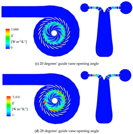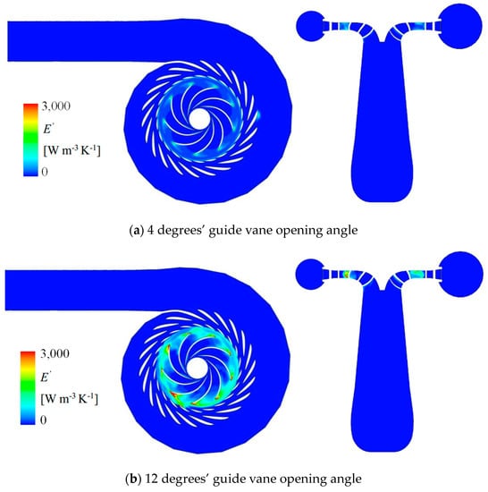 Figure 11 shows the Flow energy dissipation in pump-turbine. When the opening of the guide vane is at 4 degrees, the position with strong energy dissipation is located in the area between the guide vane and the runner. Among them, the leading edge of the runner blade is the strongest, and the maximum value of E′ is about 1000 W/(m3K). When the opening of the guide vane is at 12 degrees, the position with strong energy dissipation is still located in the area between the guide vane and the runner. The maximum value of E′ at the leading edge of the runner blade can reach over 3000 W/(m3K). When the opening of the guide vane is at 20 degrees, the energy dissipation in the area between the guide vane and the runner is still strong. However, the area where the E′ on the leading edge of the runner blade exceeds 3000 W/(m3K) is actually smaller than when the guide vane opening is at 12 degrees. When the opening angle of the guide vane increases to 28 degrees, the area of the E′ on the leading edge of the runner blade exceeding 3000 W/(m3K) significantly increases. From the perspective of entropy production rate, according to the second law of thermodynamics, a decrease in fluid mechanical energy transforms into an increase in internal energy. Therefore, the stronger E′ represents a decrease in flow velocity and an increase in temperature, which is closely related to the pulsation of the flow field.
