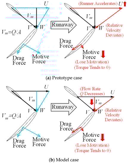 This study is based on model experiments or model-scale numerical simulation analysis. In the model scale, experiments were conducted to find a point with a torque of 0 by adjusting the supply pump based on the fixed rotational speed of a rotor given by the motor. In fact, during the runaway process of the prototype pump-turbine, the fluid enters the runner uncontrollably, causing the runner speed to increase to a maximum limit value. At this point, the torque is 0, and the corresponding speed needs to be tested to determine it. Compared between the two situations, the model scale refers to a relatively stable state driven by the runner, while the prototype scale refers to a state where the rotational speed repeatedly fluctuates slightly under the flow’s driving. There may be differences in dynamics between the two, as shown in Figure 12. The components in velocity triangle [32] are the rotational linear velocity of runner U, relative flow velocity W, absolute flow velocity V, and meridional absolute velocity Vm. Vm is equal to Q/A, where Q is flow rate and A is flow passing area. Both the runner’s acceleration and the flow rate’s decreasing will make the runner to lose motivation and become runaway. There may also be some differences in the characteristics of pressure pulsation and force (including motive force and drag force), which need to be further studied and explored in future research.