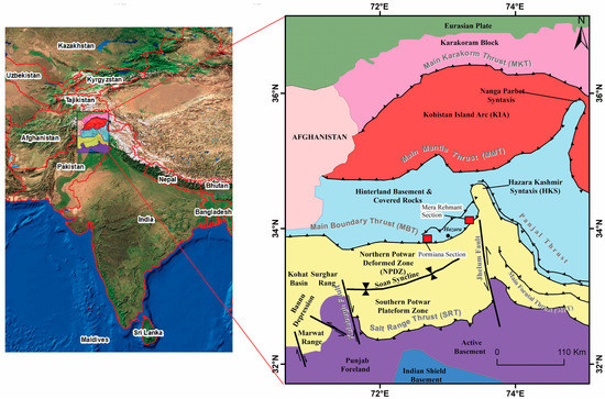 - Qasim, M.; Ding, L.; Khan, M.A.; Jadoon, I.A.K.; Haneef, M.; Baral, U.; Cai, F.; Wang, H.; Yue, Y. Tectonic implications of detrital zircon ages from lesser Himalayan Mesozoic-Cenozoic strata, Pakistan. Geochem. Geophys. Geosystems 2018, 19, 1636–1659. [Google Scholar] [CrossRef]