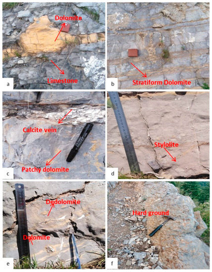 Field photographs showing: (a) grey limestone and yellow dolomite, (b) bedding parallel dolomite, (c) patchy dolomite with a thin calcite vein, (d) bedding parallel stylolite, (e) dolomite and Dedolomite, and (f) erosive surface.