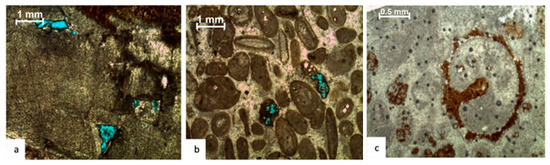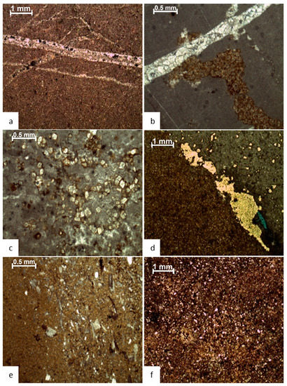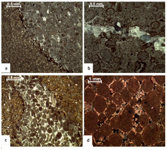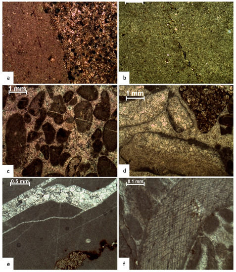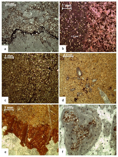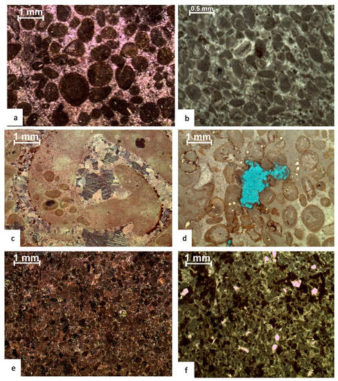 The depth-dependent porosity distribution and compaction trends are influenced by various textures, diagenetic conditions, and mineralogies [58,59]. Various horizons record the detailed distribution of these features in individual microfacies. In the investigated section, broken and cracked ooids along the lamellae and broken cortical layers are common. Mudstone (micrite) is often converted into microspar owing to compaction; however, compaction is not uniform across all microfacies (Figure 9b).