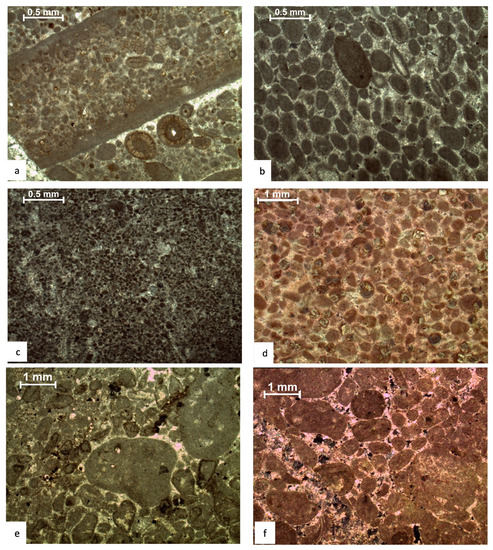 Photomicrographs of microfacies of Samana Suk Formation: (a,b) ooidal grainstone, (c,d) peloidal grainstone, and (e,f) intraclastic peloidal grainstone.