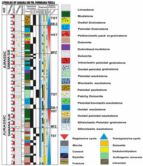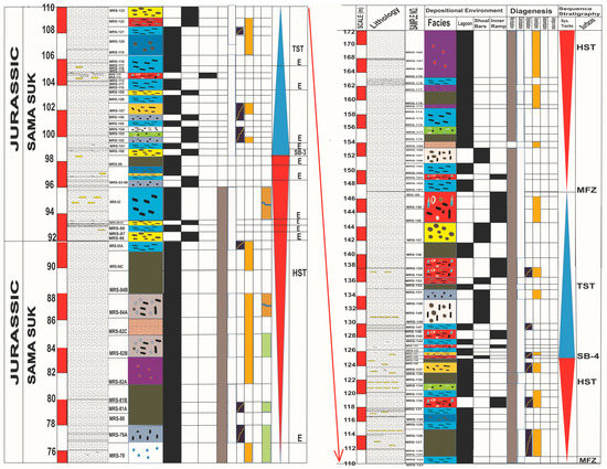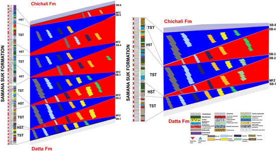 The Samana Suk Formation represents deposition in three different environments: open marine, lagoon, and shoreline/coastline. According to the microfacies and sequence stratigraphic data, the Samana Suk Formation is composed of a 2nd-order local cycle, which is equivalent to the global sequences reported by Haq et al. [60]. Similarly, the Samana Suk Formation’s 3rd-order sequences comprise five High-stand Systems Tracts (HSTs), five Transgressive Systems Tracts (TST) in the Mera Rehmat section (Figure 11), and three TST and two Highstand Systems in the Por Miana section (Figure 12). The Samana Suk Formation has recorded third-order system tracts (Figure 11 and Figure 12).