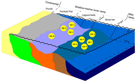 - Beigi, M.; Jafarian, A.; Javanbakht, M.; Wanas, H.A.; Mattern, F.; Tabatabaei, A. Facies analysis, diagenesis and sequence stratigraphy of the carbonate-evaporite succession of the Upper Jurassic Surmeh Formation: Impacts on reservoir quality (Salman Oil Field, Persian Gulf, Iran). J. Afr. Earth Sci. 2017, 129, 179–194. [Google Scholar] [CrossRef]