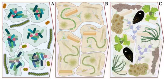 Bacteria are the first colonizers on almost all marine submerged surfaces (A), both live (as algae, seagrasses and invertebrates) and abiotic. They are promptly followed by diatoms and other microalgae, producing a first basal layer (B), named the “conditioning film”. This film is essential for further successions, promoting the adhesion of plant and animal macro-epibionts (C).
