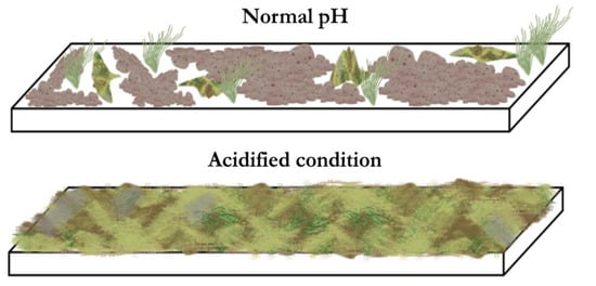 Due to the high solubility of their skeleton, which has a high magnesium content [], encrusting red algae (Corallinales) show strong vulnerability to the phenomenon of acidification []. Under normal conditions, they act as pioneer species in the colonization of the leaf surface of P. oceanica that, once established, help to condition the adhesion and colonization of other groups of organisms []. While corallinales often represent the dominant group of epiphytic colonizers along the leaves of P. oceanica, in acidified sites the algal epiphytic assemblage is mainly composed of flashy algae, both encrusting and erect brown and green algae. In those environments, the community structure of epiphytic assemblages undergoes a strong reduction in terms of taxonomic diversity due to the decrease/absence of corallinales, leading a community dominated by flashy and turf algae. The resulting epiphytic community faces a trivialization of its biodiversity, appearing more homogeneous and strongly impoverished. After the initial colonization, the assemblages of epiphytes present in natural acidified areas seem not to evolve, remaining in their initial state []. The disappearance of the coralline red algae could affect the subsequent stages of colonization, causing cascade effects on the trophic web associated with the canopy and the functioning of the entire ecosystem []. Furthermore, the scarce or totally absent corallinales cover may induce a great palatability of the leaves, enhancing the grazing activity, especially by some fish, such as Sarpa salpa, whose abundance tripled close to the vents compared to ambient pH sites []. The increased grazing led to evident modifications in the leaf canopy of P. oceanica in acidified areas, which could suggest a possible correlation between the phenology of the seagrass and the structure of the epiphytic community []. Although the canopy presents a high shoot density in acidified zones, the Posidonia leaves appear narrower and shorter than under normal pH conditions, resulting in a decrease in available surface area for epiphyte colonizers.