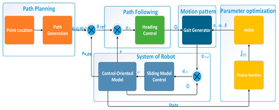 | Input: X0, Y0: Horizontal and vertical coordinates of waypoints Vx, Vy: The current in the global coordinate system N: The number of links of USR Explanation: S0: Virtual point values corresponding to waypoints on the planned curve S: Virtual point values of simulation u: Nonsingular terminal sliding mode controller input Initialize the state of USR and define its relevant parameters. 1: Using coordinates of waypoints X0, Y0 plan a smooth path according to Equations (7) and (8); 2: while (S(t) < S0(end)) 3: Using Equation (15), update the value of the virtual point; 4: Using ILOS, calculate reference heading angle; 5: for i = 1: N − 1 6: Obtain sinusoidal reference signal with Equation (6); 7: end for 8: Obtain controller input u with Equation (13); 9: Update USR’s status; 10: Update gait parameters of USR with optimization algorithm MISSA; 11: t = t + 1 12: end while |
