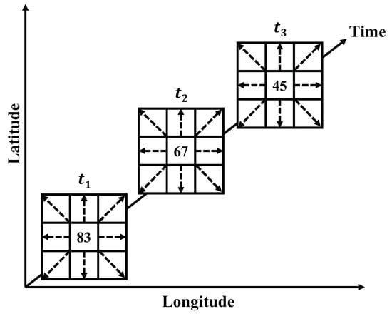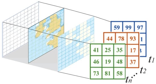 The environmental grid data in this paper include meteorological and oceanographic data from the European Centre for Medium-Range Weather Forecasts [37] and ocean bathymetry data from the General Bathymetric Chart of the Oceans [38]. Each two-dimensional grid datum at a single time is read from the environmental data and recorded in the form of a matrix. These multiple time matrices are stored in a 3D matrix, as shown in Figure 1, where represent the meteorological and oceanographic information in the grid cells at discrete times t, and the time interval between them is generally fixed. Moreover, the environmental data in row x and column y at time t are defined by . The environmental effect on a ship can be expressed as follows: