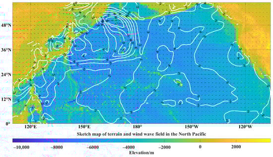 After reading and storing the environmental data, the data representation is shown in Figure 2. The white contour lines in the figure are contours of wave height, the direction of the arrows indicates the wind direction, their length indicates the value of the wind speed, and the elevation is represented by the isosurface.