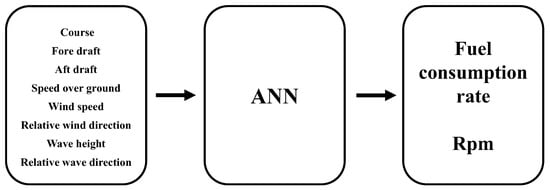 Thus, eight input variables which meet the above characteristics have been selected to establish an ANN-based model for fuel consumption rate and RPM prediction, including ship data such as the SOG, ship course, fore draft, aft draft, and sea environment data such as relative wind direction, relative wave direction, wind speed, and wave height. The relevant variable mapping relationship is shown in Figure 5.