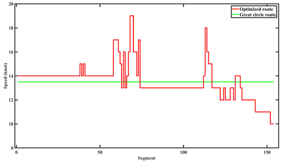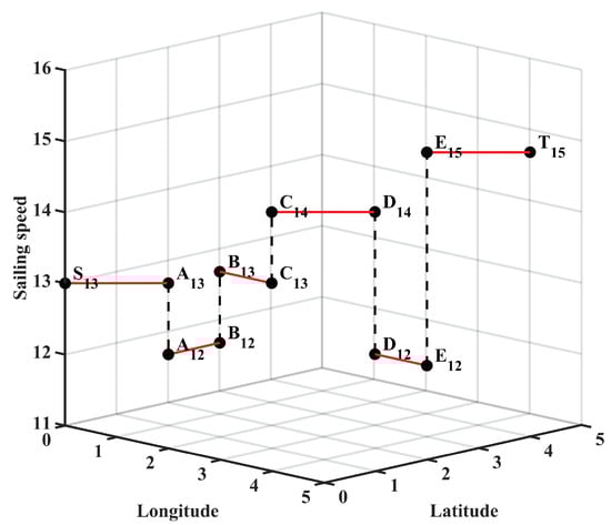 Therefore, a speed configuration can be a part of an optimized route, as shown in Figure 8. The expression form of the optimized route from the starting node S to the end node T evolves from the original to . That is, the ship sails from the origin node S to node A at 13 kt, from node A to node B at 12 kt, and continues sailing until from node E to the end node T at 15 kt. With this method, the optimized route not only contains the optimized route (Figure 9) but also includes the optimal speed in each segment (Figure 10) to realize the synergistic optimization of the ship’s course and speed.