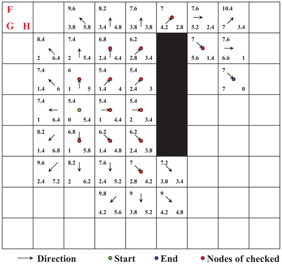The A* algorithm calculates and iterates the node selection according to this evaluation function. Its basic process is as follows: the total movement cost of surrounding nodes is calculated from the starting node. The node with the minimum movement cost is selected in each iteration until the end node is found. The process is shown in Figure 11.