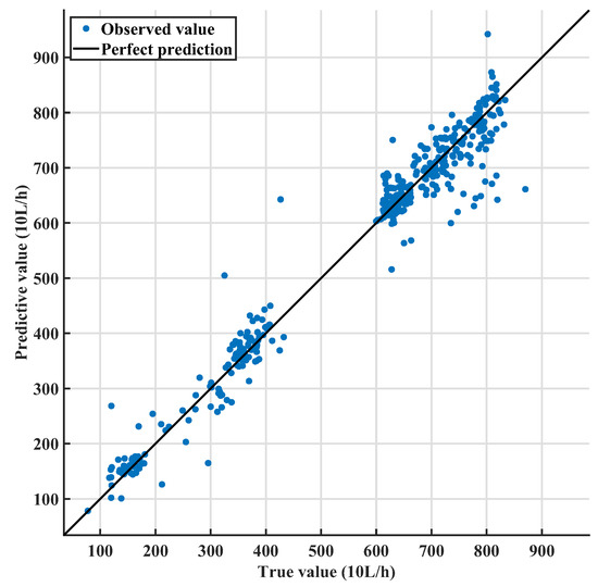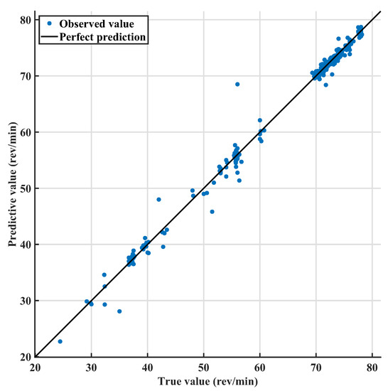 A perfect predictive model should have a predicted value equal to the true value, which means the points would lie on the black diagonal line. The vertical distance from the line to any point is the prediction error for that point. A good model has minor errors, as Figure 14 and Figure 15 show; all the blue dots surround the black lines, and the average relative error of the fuel consumption rate model and RPM model are 0.0594 and 0.0101, respectively. Thus, the above models can meet the navigation requirements in practice and can be used in the ship route optimization process to calculate fuel consumption and RPM.