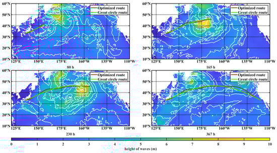 The distribution of and variation in the wind and waves during the voyage are demonstrated in Figure 16, where “80 h” refers to the situation that the optimized route chooses to sail to higher latitudes in advance based on the analysis of meteorological information; at about 165 h and 230 h, there are heavy winds and waves on the great circle route, and the optimized route avoids this area in advance; “367 h” is the comparison of the two routes after reaching the destination point.