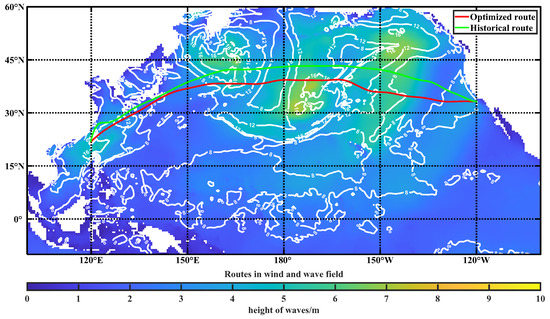 In this scenario, a voyage from Tainan (23 N, 120 E) with a departure on 17 January 2021 at 07:00 UTC with a destination of Los Angeles (34 N, 120 W) was simulated, and its expected duration is 410 h. The primary purpose is to compare the optimized route with the historical route to evaluate the effectiveness of the algorithm. Some experimental parameters of the ship are the same as in Scenario 1.