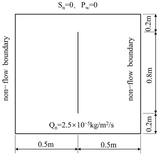 The example in [15] was used to verify the correctness of the numerical model of two-phase flow in the fracture–pore dual medium. In this example, gas injection in the saturated fractured porous medium was studied. The geometry of the model is shown in Figure 1. The size of the model is 1 × 1 m, and there is a vertical crack in the middle with an equivalent hydraulic aperture of 5 mm.