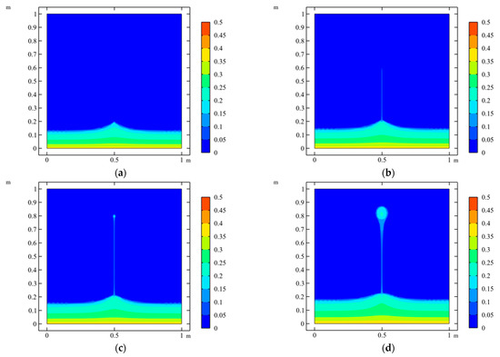 The initial conditions of the whole area were Sn = 0 and Pw = 0, respectively. The boundary conditions at the top of the model were Dirichlet boundaries, which was Sn = 0, Pw = 0; the boundary conditions at the bottom of the model were Neumann boundaries with a gas injection rate of 2.5 × 10−5 kg/m2/s; and the other two boundaries were no-flow Neumann boundaries.