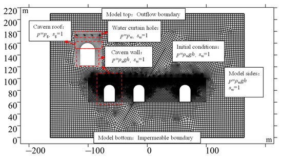 Regarding the boundary condition for groundwater seepage, the left and right boundaries of the model were considered water head boundaries with the pressure of m. Meanwhile, the top and bottom boundaries of the model were treated as zero flow boundaries. During the construction phase, the designed groundwater level of the cavern was set to 120 m from the top of the cavern, while the pressure of the water curtain hole was maintained at 150 kPa, and the boundary of the cavern was considered as having a pressure head of 0 m. When in oil storage conditions, the liquid oil product floats on the water cushion, and the saturated vapor occupies the upper part above the liquid oil. In this study, the thickness of the water cushion layer was neglected, and the density of the liquid oil was set as 850 kg/m3, while the saturated vapor pressure was set as 0.2 MPa. The boundaries of the vault, side wall, and floor of the cavern are determined based on the oil vapor pressure and the oil storage pressure, respectively.