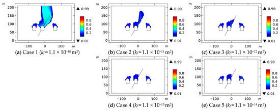 Figure 4 depicts the contour of oil vapor leakage distribution for Case 1 to Case 5 after 50 years of storage. It is observed that when the fracture permeability was 1.1 × 10−10 and 1.1 × 10−11 m2, which is approximately 106 and 105 times higher than the surrounding rock permeability, the flow of groundwater in the fracture towards the cavern was substantial. In situations where the groundwater in the surrounding rock was insufficient to supply the fracture, the fracture became unsaturated. In Figure 4a,b, unsaturated fractures became the primary pathway for oil vapor leakage. When the fracture permeability was 1.1 × 10−12 m2 (Case 3), which was still significantly higher than the surrounding rock permeability by a factor of 104, the extent of oil vapor leaked along the fracture was not as pronounced as in Case 1 and Case 2. In contrast, when the fracture permeability decreased to 1.1 × 10−13 and 1.1 × 10−14 m2, which was about 103 and 102 times the surrounding rock permeability, the flow of groundwater in the fracture to the cavern was minor, and the fracture was continuously replenished by the groundwater in the surrounding rock. As a result, the fracture remained fully saturated, and there was no leakage of oil vapor along the fracture.