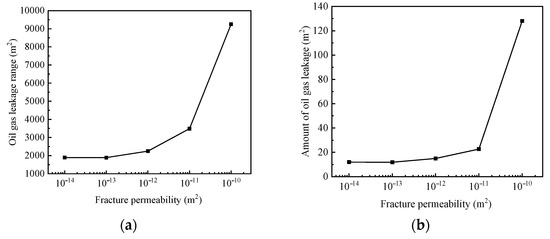 The variation in (a) oil leakage range and (b) amount of oil leakage versus fracture permeability.