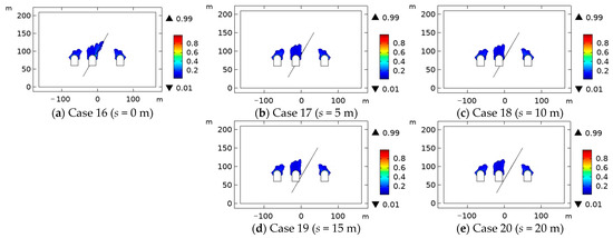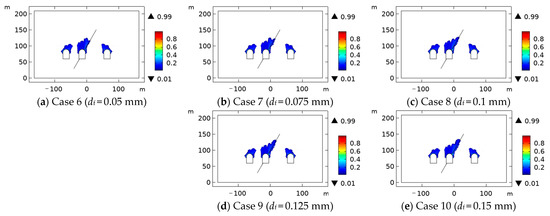 Figure 10 shows the contour of the range distribution of leaked oil vapor after 50 years of storage for Cases 16 to 20. It can be observed that when the fracture passed through the cavern, the fracture was the main oil vapor diffusion channel, and the oil vapor was distributed in a large area around the fracture (Figure 10a). As the distance between the fracture and the cavern increased, the leakage of oil vapor along the fracture became less obvious. When the fracture is located outside the cavern, oil vapor will not leak along the fracture (Figure 10d,e).