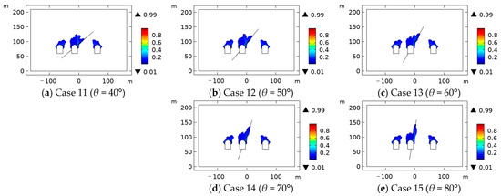 Figure 8 is the contour of oil vapor leakage distribution after 50 years of storage for Case 11 to Case 15. As the fracture inclination increased, leaked oil vapor migrating along the fracture became more obvious. This is because the larger the inclination angle of the fracture, the faster the groundwater flowed along the fracture. When the groundwater in the surrounding rock mass cannot be replenished in time, the fracture becomes unsaturated, and oil vapor spreads more easily.