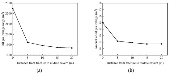 Variation in (a) range of oil vapor leakage; and (b) amount of oil vapor leakage versus distance from fracture to the middle cavern.