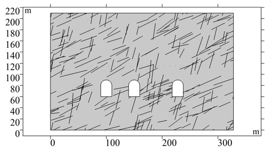 The oil depot area is a granite landform with F3, F7, and F8 faults and fractured zones. According to the survey results of the Huangdao underground cavern site area, the distribution of faults and the origin of structural planes, and the principle of similarity in the area and differences in intervals, the structural plane of the oil depot area can be divided into five areas. To facilitate problem analysis, this paper selected a group of typical cross-sections of a group of caverns located in Zone IV of Huangdao underground water-sealed caverns to carry out a numerical simulation of oil vapor leakage and migration during the storage period. Regardless of construction roadways and shafts, the selected sections were calculated as shown in Figure 12.