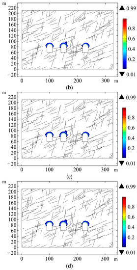 According to the data, Zone IV was mainly near the SN direction, with NE45°~NE60° and NE30° structural planes. In addition, according to the statistical data of structural planes in the region, it was found that the overall trend of the cavern area was from NW330°~NW345° to NE45°~NE60°. According to the geological survey of the reservoir site area and the statistical results of on-site joints and fissures, the inclination angles of joints and fissures in the analysis area were mostly 20°–40°, 55°–80°; the joint density was 0.35–1.50 pieces/m. The depth was about 1 bar/m. According to the above actual engineering geological survey results in the reservoir area, the geostatistical fracture parameters of Zone IV of Huangdao Oil Depot obtained in the model are shown in Table 2.