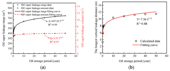 The coefficient of determination (R2) for all three equations was greater than 0.88, which indicates that the fitting formulas can accurately describe the variation trend of the oil vapor leakage range, leakage volume, and the longest vertical leakage distance during the oil storage period.