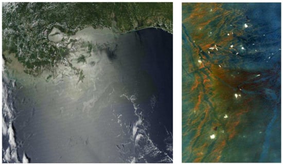 The 2010 Gulf of Mexico oil spill was one of the worst crude oil spills in history [2], as Figure 1 shows. Crude oil erupted from the Deepwater Horizon deep-sea rig, and the spill lasted for three months, causing continuous damage to the marine environment. The study of this is a good source of publicly available datasets via hyperspectral image acquisition in NASA laboratories. NASA’s Airborne Visible/Infrared Imaging Spectrometer (AVIRI-S) measured a total of more than 100,000 km2 of ocean during the spill to help scientists and the relevant authorities to better understand the spill and how to address its effects [17,18]. The data in this study are based on AVIRIS, recording 224 bands in the wavelength range of 400–2500 .