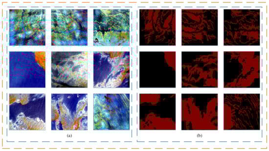 The pre-processed images were manually labeled using LabelMe software, a deep learning dataset labeling tool. We obtained data with oil spill labels, where the pixel value “0” means “non-oil-spill” and the pixel value “1” means oil spill. During the production of the dataset, we marked the areas where oil spills existed with the software. Areas where oil spills did not exist, such as ordinary ocean surfaces, ships, etc., were used as background. The difference between the oil spill area and the non-oil spill area in the dataset was that the oil spill area contains only oil film, while the non-oil spill area contains ordinary ocean surface, ships, etc. To prevent the model from overfitting, the data were enhanced via horizontal flipping, vertical flipping and arbitrary small angle rotation, and 2781 images were obtained. Samples of the data set are shown in Figure 2. The samples were then randomly divided into three parts, i.e., training set, validation set and test set, with the ratio of 5:3:2. Half of the data were used to train the model; 30% of the data were used to validate the model parameter tuning and model selection and 20% of the data were used to evaluate the performance and generalization ability of the model. This ratio allowed for more accurate evaluation of the model parameters, selection of the model that works best, reduction of overfitting with limited data and improvement of the generalization ability of the model. The test set had a relatively small proportion, but was able to complete the final evaluation of the model. Generally speaking, the number of samples used in this study was sufficient to ensure that the improved model had good generalization ability.