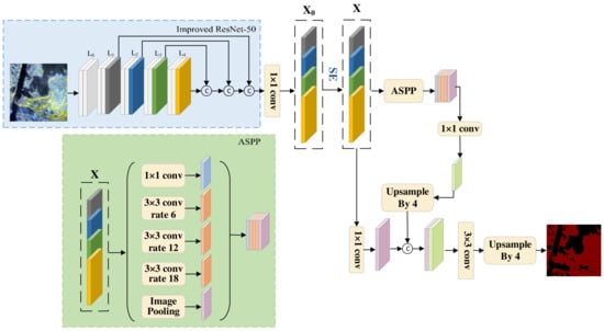 Figure 3 shows the general framework of the oil spill segmentation model with scale feature fusion. Firstly, we used ResNet-50 as the backbone network for feature extraction, which consists of one convolutional block and four residual blocks. denotes the first convolutional layer, and , , and denote the four residual blocks with different colors. After stitching the four different scales of feature layers, a convolution block was added to enhance the nonlinear characteristics to obtain feature . Feature was refined using the Squeeze and Excitation (SE) module [36] from each different layer to obtain feature . was passed through the pyramid pooling (ASPP) module and convolved by 3 expansions of size with expansions of 6, 12 and 18, respectively, to obtain a perceptual field as large as possible without losing too much resolution. Finally, , as the shallow features containing more object boundaries and textures, was stitched with the advanced features processed using the pyramid pooling (ASPP) module and then upsampled for the final oil spill area segmentation.