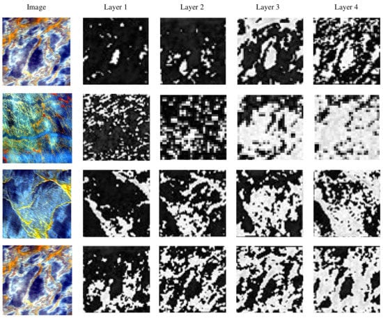 To evaluate the predictive power of the feature maps from different layers, we extracted individual feature maps from layers 1 to 4 of ResNet-50 to train our model. The intermediate feature map is shown in Figure 4.