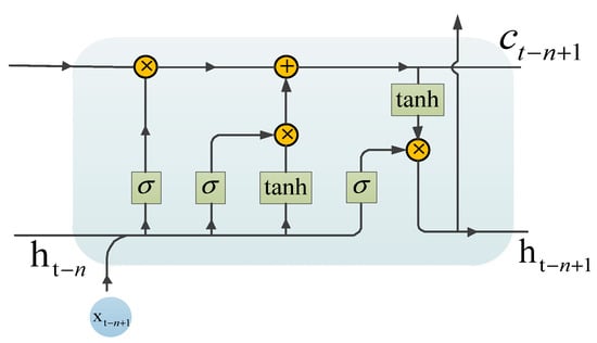 Long short-term memory (LSTM) is a type of recurrent neural network (RNN) model with gate mechanisms that can effectively solve the problem of gradient vanishing/exploding [,,]. The traditional RNN model achieves information transmission and processing by recursively updating the hidden state. However, the backpropagation of the model has problems, which can easily result in vanishing or exploding gradients, making the model difficult to train. The LSTM model introduces the concepts of input gate, forget gate, and output gate to address this issue. The core component of the LSTM model is the LSTM unit, whose structure is shown in Figure 1. The input gate and forget gate control the input and forgetting of the information, while the output gate controls the output of information [,,,]. These gates include parameters such as weights and biases, which are learned through the backpropagation process to solve these problems. LSTM models have been widely used in natural language processing, speech recognition, and image recognition, and have become one of the most prominent models in the field of deep learning [,].