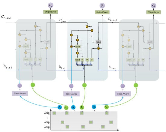 trepresents the input to the current hidden layer, represents the previous time step Information, ,, and are the network parameters for the forget gate, input gate, output gate, and candidate memory. If there is a large time gap between time step t and t−1, this indicates that the ship has not recorded new information for a long period of time. The short-term memory of the output at the current time step should not be overly dependent on the current status, but needs to be adjusted proportionally to the time span between time steps t and t−1. The formula is as follows: