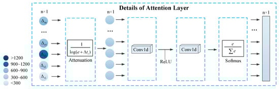 is an attenuation function that reduces the impact of short-term memory as time increases; e represents the natural number; Δt is the time interval between two ship trajectory points. Finally, multiple convolutional layers perform deep feature extraction on the balanced time interval sequence to obtain time difference weights that can accurately reflect the strength of the input signal.