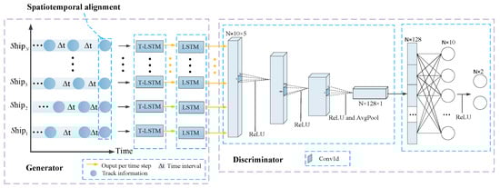Multi-ship trajectory analysis refers to the analysis and prediction of the trajectory trajectories, speeds, headings, and other information of multiple ships. This paper proposes a new method that integrates the generative adversarial network (GAN) and time-aware LSTM model for this purpose, as shown in Figure 4. GAN consists of a generator network and a discriminator network: the generator network generates simulated data, while the discriminator network determines whether the input data are real or generated [,]. The generator network is continuously optimized to confuse the discriminator network, while the discriminator network is simultaneously optimized to accurately identify generated data and real data.