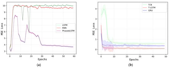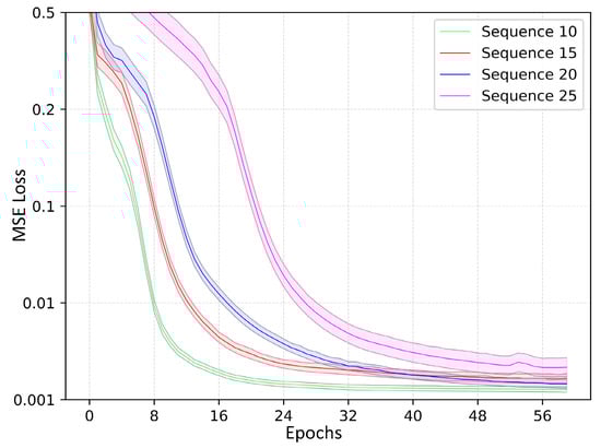To illustrate the generalization ability of various hidden-layer dimensions, the number of T-LSTM’s hidden layers was set as 10, 15, 20 and 25. The testing effect is shown in Figure 6. Since changing the total number of input time steps would affect the number of parameters, calculation time, and the memory consumption of the model, the number of parameters of the linear layer in the T-LSTM input gate, forget gate and output gate were appropriately increased when dealing with short time steps to evaluate its performance. The Adam optimizer was selected as the training optimizer and the training cycle was 120. The learning rate was initially set at 0.01, which was reduced to half of the original rate every 40 times.