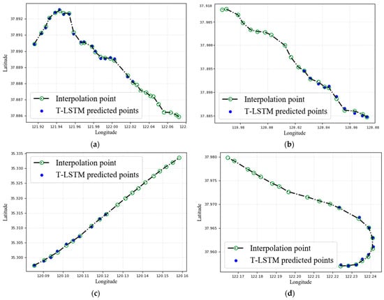 In this research, representative sea area data were selected to test the T-LSTM model under various trajectory conditions, such as straight sailing, zigzagging sailing, turning, and turning around; the test effect is shown in Figure 7. The experimental results show that the T-LSTM model has an excellent performance in the four tasks, particularly in the straight task, where its prediction accuracy is remarkably high. The prediction accuracy of the T-LSTM model can maintain a certain level of accuracy, even in the case of the ship’s fast turning, which can effectively capture the ship’s trajectory characteristics. These results show that the T-LSTM model has good application prospects and can provide an effective solution for ship-trajectory prediction, making a significant contribution to the development of related fields.