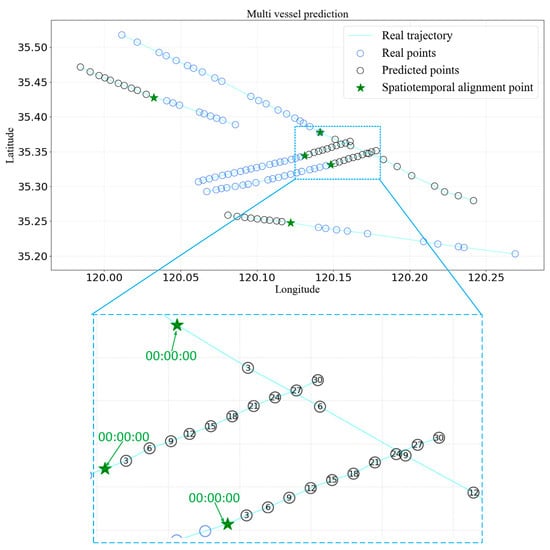 When predicting multiple ship trajectories simultaneously, the beats of the time series presented by the AIS message data of multiple ships are inconsistent, resulting in the loss of practical significance of the predicted data points. The commonly used method proposed by researchers is to interpolate or shift the trajectory points with different timestamps to align all the trajectory points in time. It is only necessary to align the last time step of the time series for all ships in the time dimension, which minimizes errors and ensures the authenticity of the data.