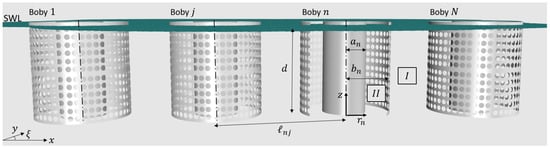 With respect to arrays of porous cylindrical bodies, in [37,38], the interaction of water waves with partially porous, truncated circular cylinders was investigated. The exciting wave forces and the wave run-up on the multibody arrangement were calculated for various porosity coefficients and wave conditions. Also, in [39], an array of porous circular cylinders with and without inner porous plates was theoretically and experimentally investigated in order to evaluate the transmission rate of the propagating waves. Toward this goal, the cylindersβ draughts, the locations of the inner porous plates, and the spacing between the adjacent bodies were adjusted for the optimization of the wave dissipation. Finally, in [40], the exciting forces and the free surface elevation around an array of dual porous cylinders were evaluated for various bodiesβ geometries, angles of wave propagation, and porosity coefficients.