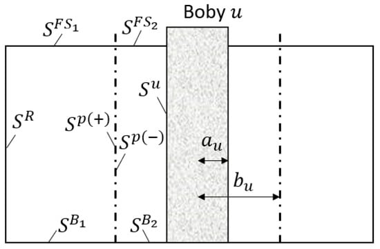 Based on the divergence theorem, we assume a finite control volume , which is bounded by the water free surface outside and inside the porous surface, respectively; the seabed surface outside and inside the porous surface, the impermeable bodyβs mean wetted surface, the bodyβs mean wetted porous surface, ; and a fixed vertical control surface, (see Figure 3).