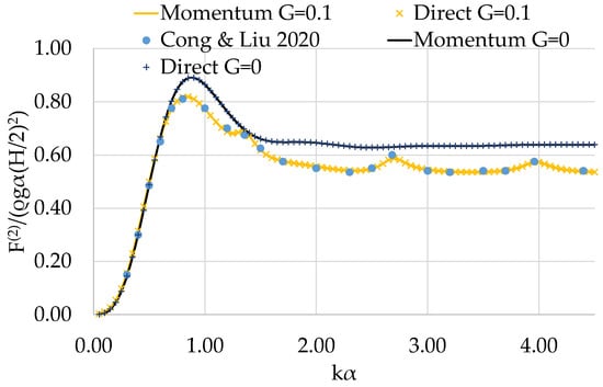A single surface-piercing vertical impermeable cylinder surrounded by a porous surface is considered. The cylinder is bottom-seated at a water depth . The porous surface has a radius , while the radius of the impermeable cylinder is . Two different porous coefficients are examined, i.e., . The mean drift wave forces on the porous structure (i.e., the impermeable cylinder and the porous surface), calculated using the two methodologies, are compared with the outcomes from [25] with excellent correlation. Specifically, in Figure 4, the horizontal mean drift forces on the structure are presented. The results are normalized by the factor . It can be seen that the outcomes of the presented methodologies (i.e., the momentum principle and direct integration method) attain similar results, which are also in excellent agreement with the results from [25]. Therefore, it can be concluded that the present formulation can effectively describe the mean drift forces on porous structures.